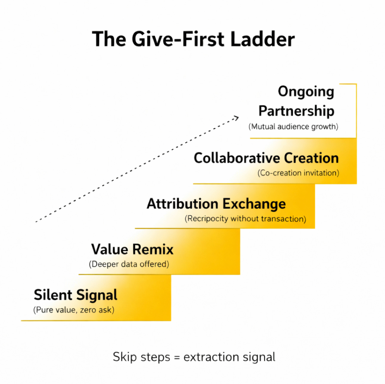 The give-first ladder inverts this. Every step deposits value before any withdrawal.