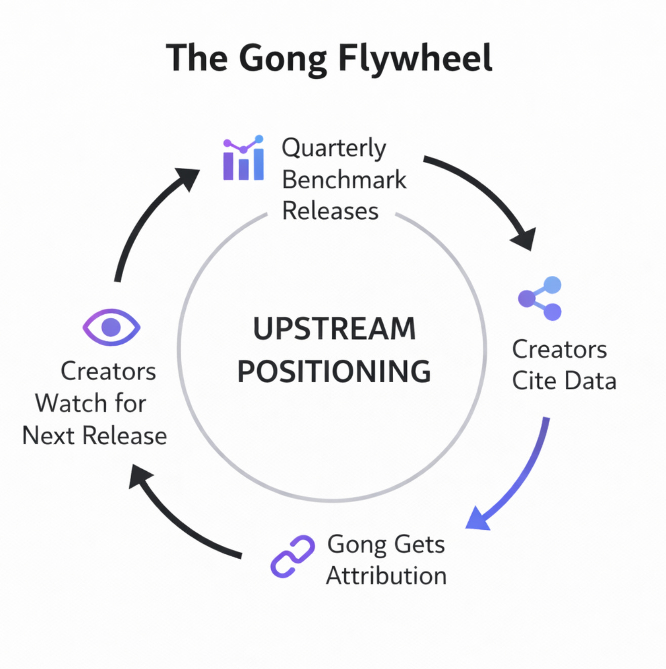 Quarterly benchmark releases → Creators cite data → Gong gets attribution → More people discover their research → Creators watch for next release