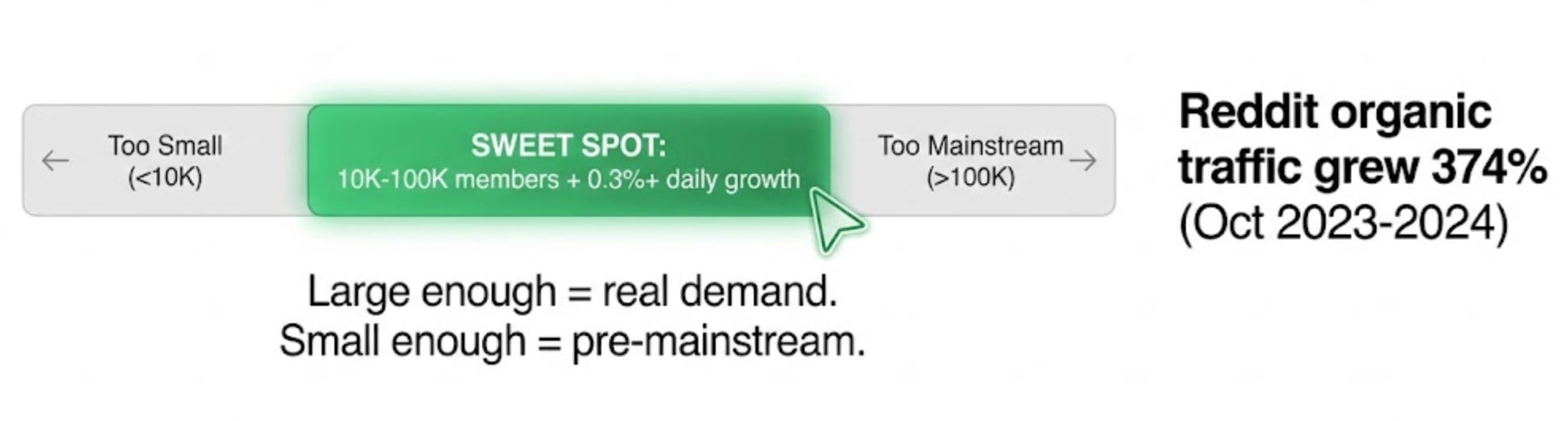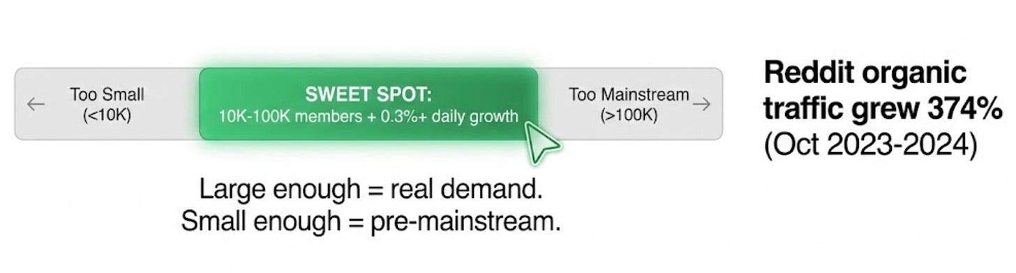 The sweet spot: subreddits with 10K-100K members growing at 0.3%+ daily. Large enough to indicate real demand. Small enough to be pre-mainstream.