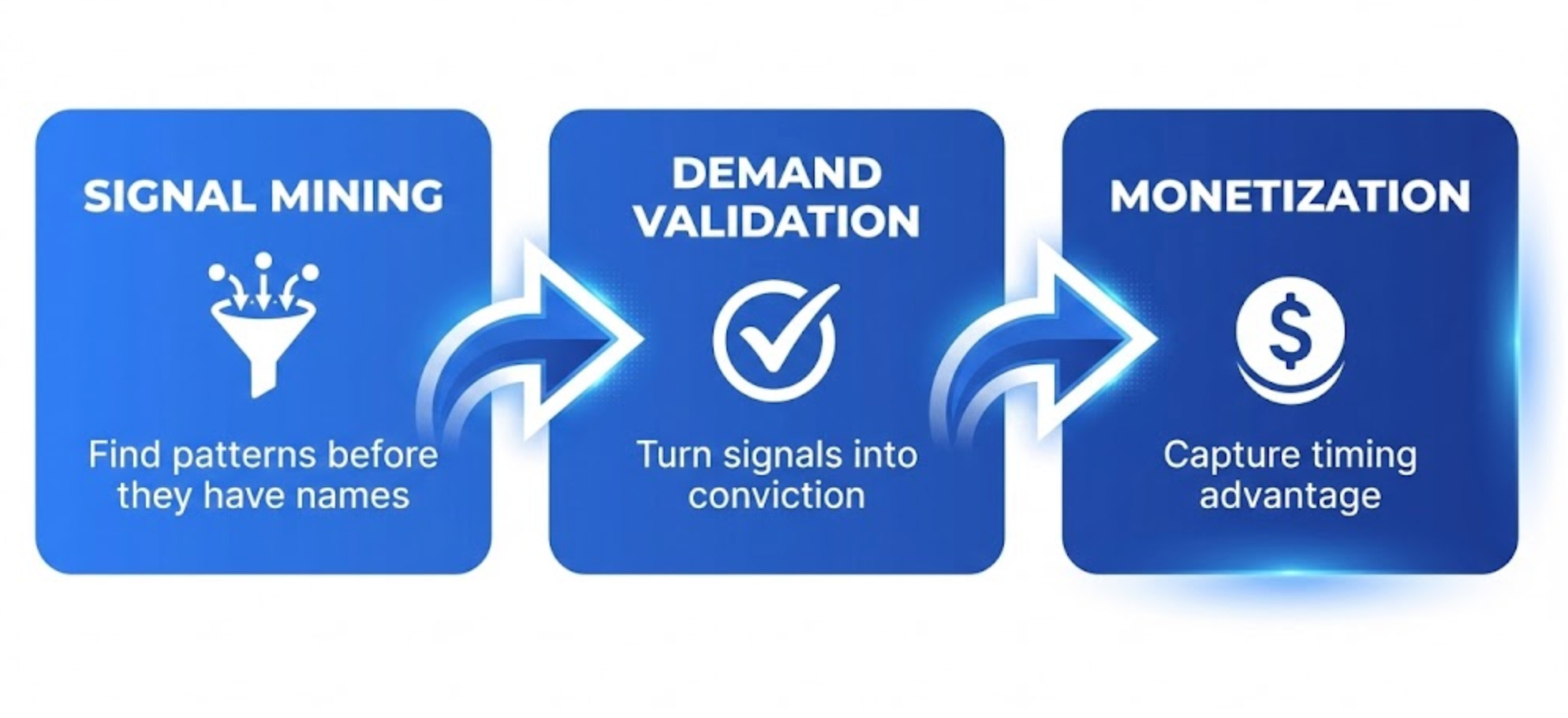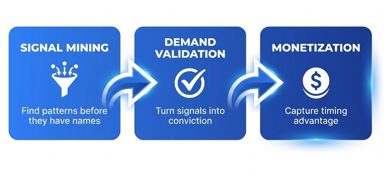 This isn’t a list of tools. It’s a three-phase system: Signal → Validation → Monetization.