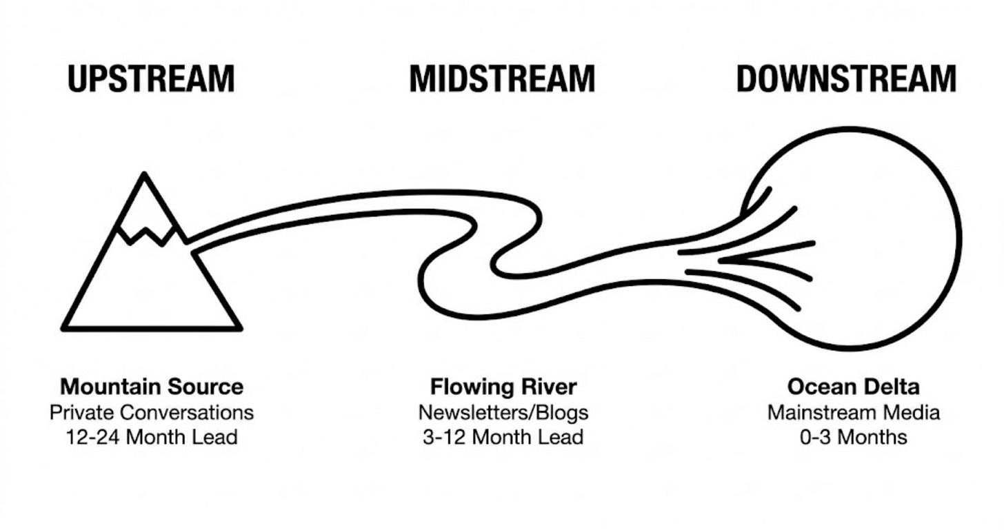 Downstream: TechCrunch headlines. LinkedIn virality. Conference keynotes. The place where everyone already knows.